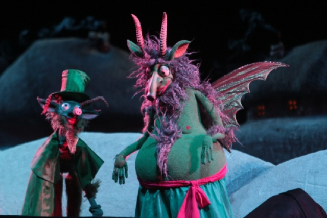 Замечательная сценография, выразительные образы кукольных персонажей, разнообразные сценические эффекты – и перед зрителями возникает зимняя Диканька, наступает магическая ночь перед Рождеством…
